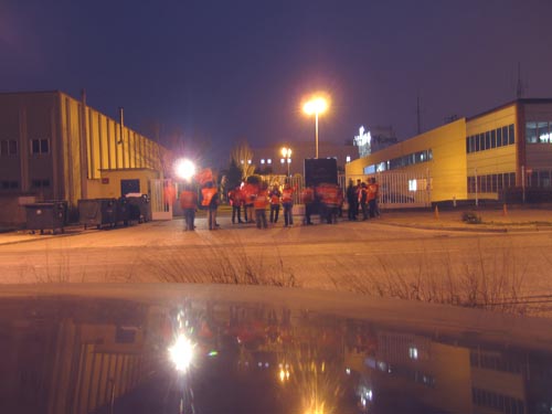 Tras la entrada del turno de las seis de la mañana (entró mucha gente a trabajar, la verdad; en su día no ví sentimiento de protesta entre la plantilla), llega el momento chanante de la jornada: se decide ir a la puerta de una empresa que comienza a las siete ¿?, así que nos montamos en los coches y nos cambiamos de calle. Durante el viaje, los compañeros con los que iba manifestaron sus dudas acerca de si esta acción realmente era inteligente, así que al llegar decidimos quedarnos dentro del coche, calenticos y secos, mientras los demás iban a la puerta de la otra fábrica. Y fue la mejor decisión que tomamos. Básicamente, porque tras estar un rato esperando en la puerta, alguien le debió preguntar al guarda de seguridad y la conversación debió ser algo así como: